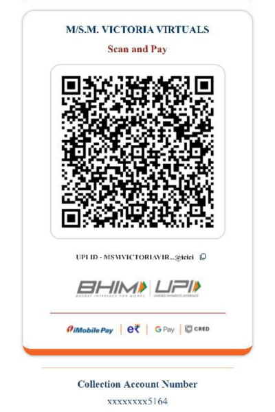 Simply scan the QR code below using any UPI-enabled mobile banking app (such as Google Pay, PhonePe, Paytm, etc.) to complete your payment for the products you’ve ordered from M. Victoria Virtuals.